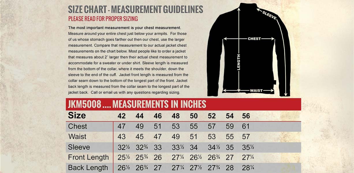 Great quality jacket and I love that it's made in the USA. Gave it 4 stars because the sizing chart is totally misleading. Based on my chest measurement (48") the chart says I should be a size 44, but I ordered a 46 because I wanted it a little loose. The 46 was ridiculously small so I exchanged it for a 48 which was also too small. I finally exchanged it for a size 50 which is perfect (a little loose so I can wear a fleece underneath.