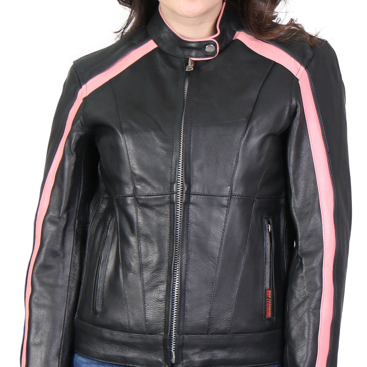 Medium weight ladies top grain leather jacket. This women’s jacket has reflective piping on the front and back as well as pink stripes up the arms and around the collar. There are 2 outside pockets and one inside pocket on this ladies riding jacket. This leather jacket for women has a zip-out quilted lining.