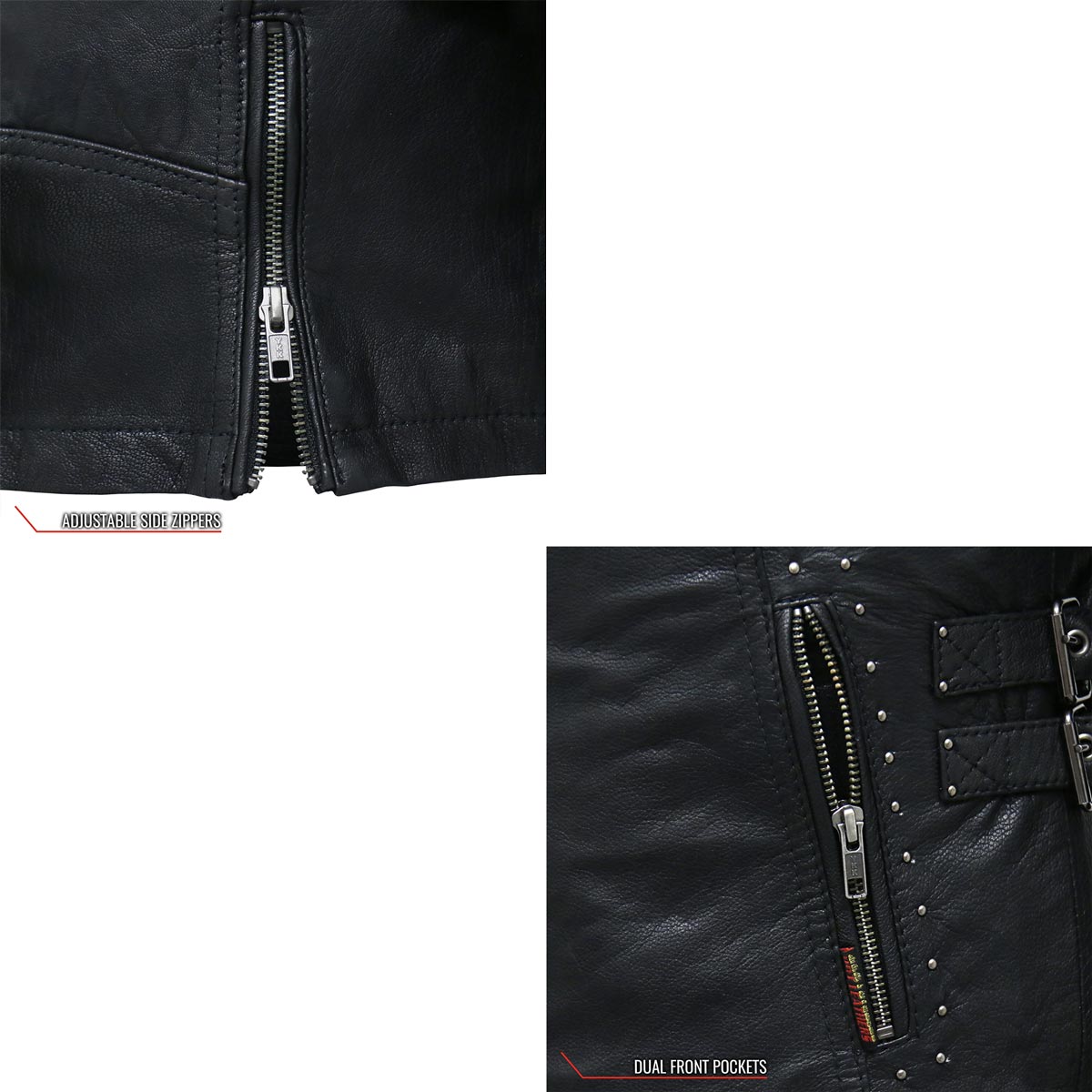 - Antiqued silver YKK zippers and collar snaps