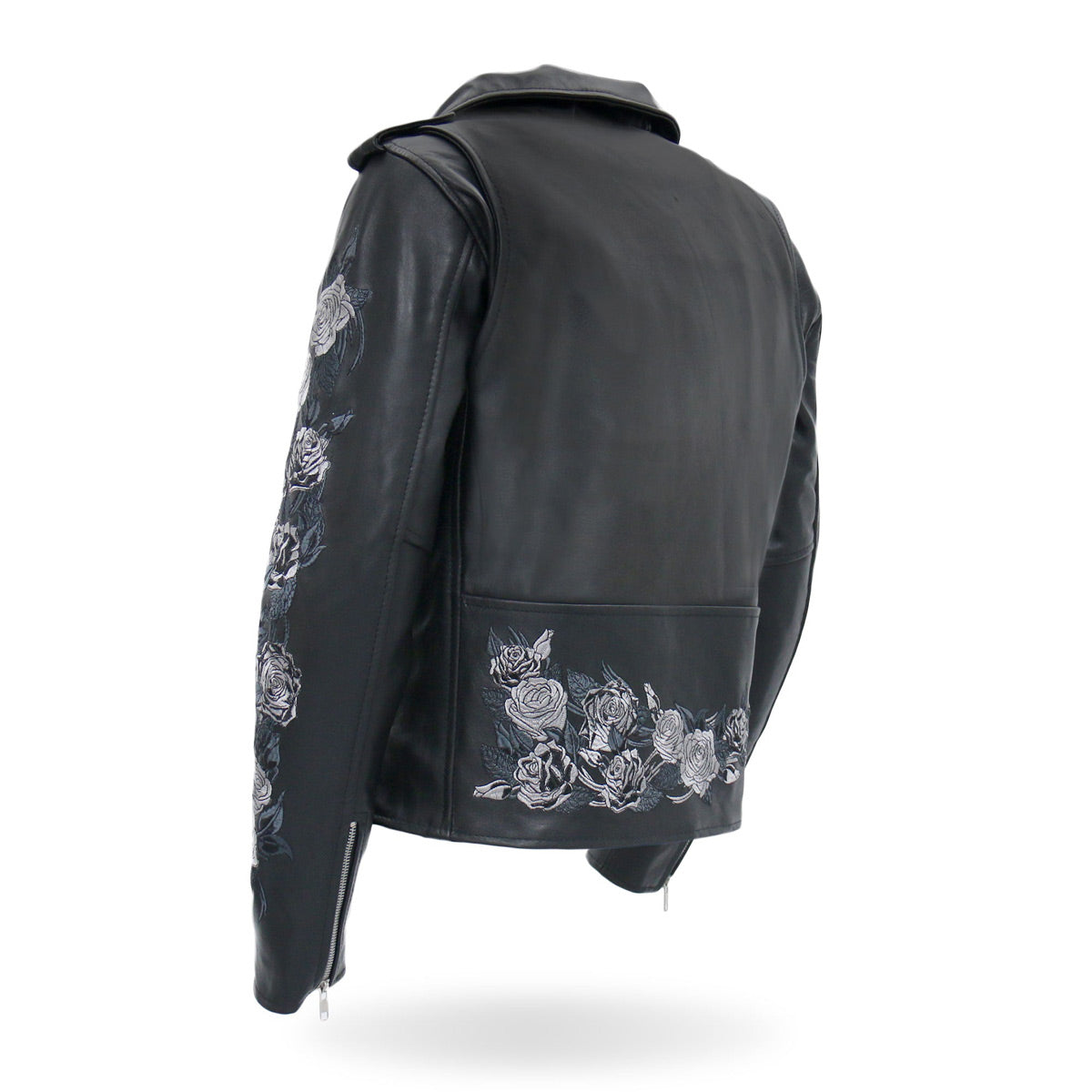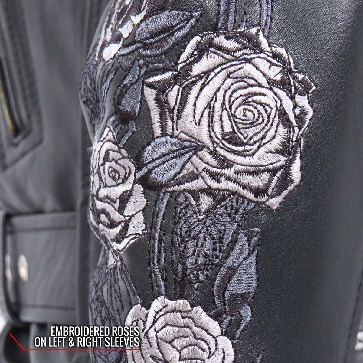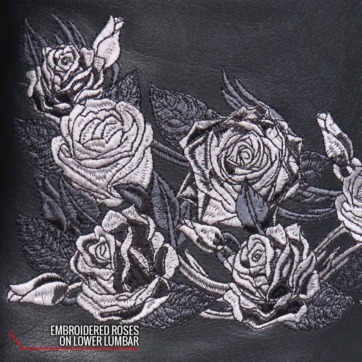 - Embroidered Rose Artwork on Each Arm and Lower Back Panel