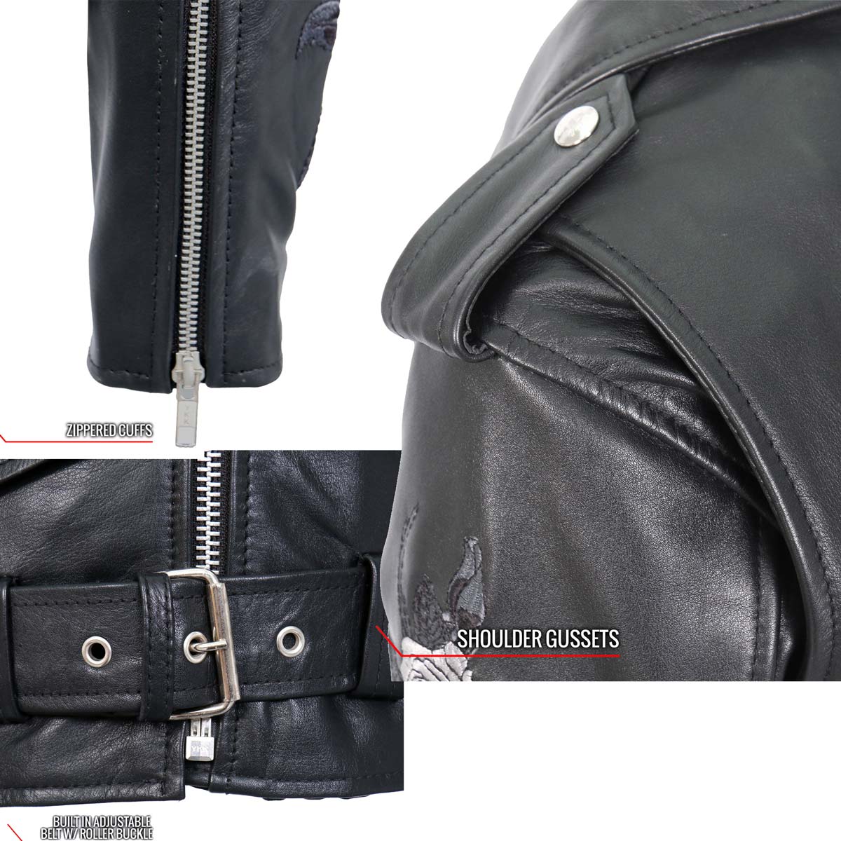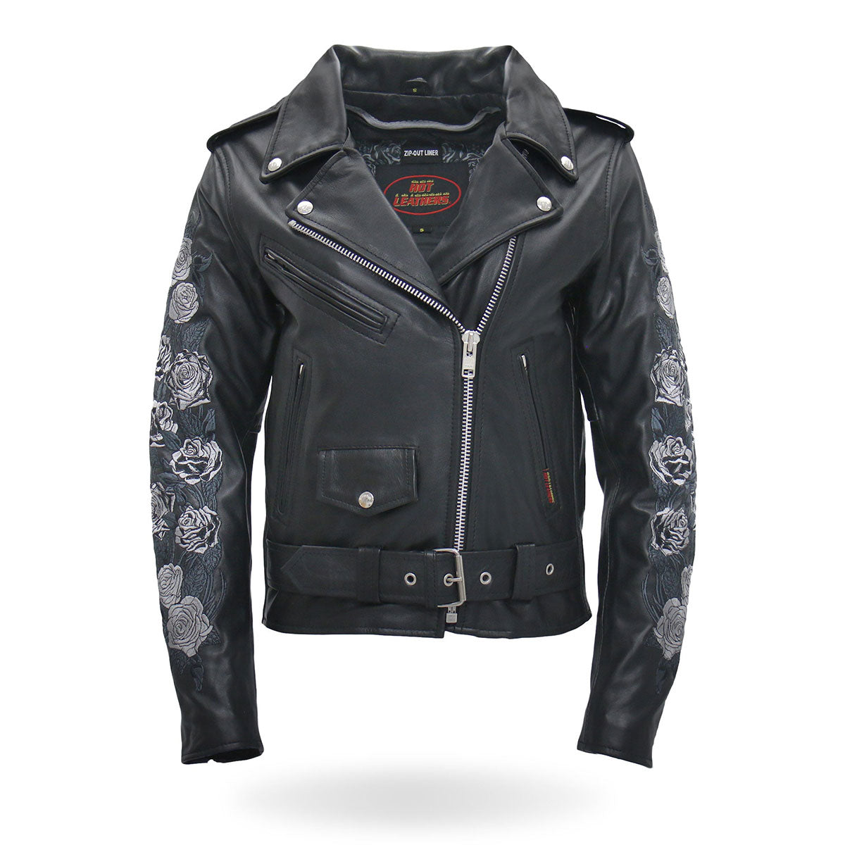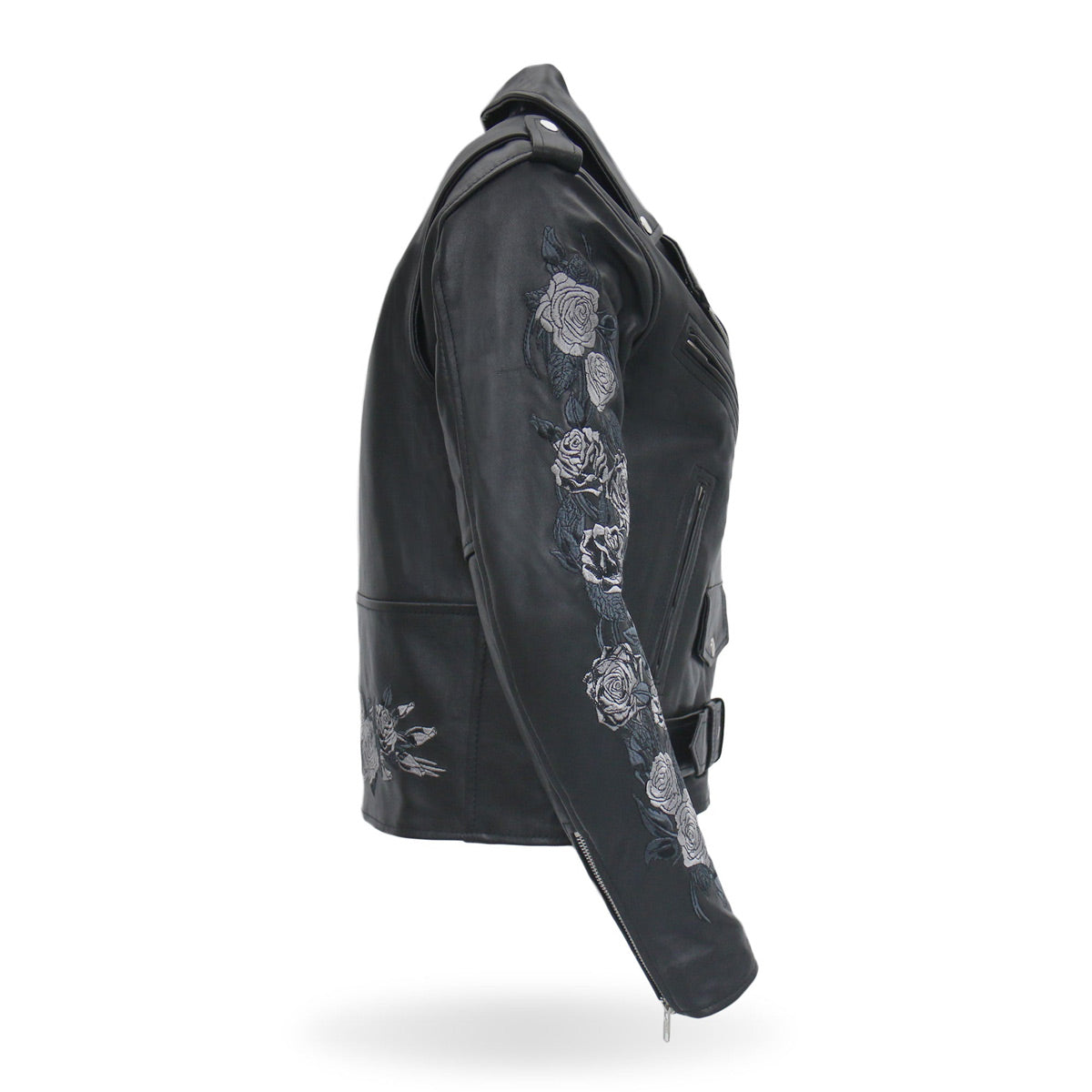 - Embroidered Rose Artwork on Each Arm and Lower Back Panel