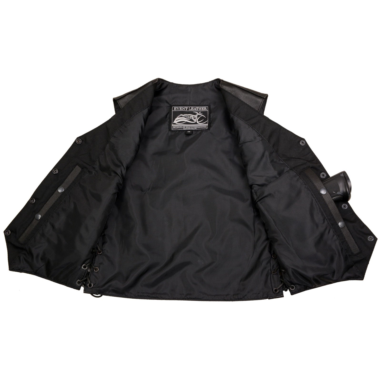 - Concealed carry functionality: This black biker vest is designed with concealed carry Conceal and Carry Pocket functionality in mind. It features strategically placed pockets with secure closures, allowing you to discreetly carry your Protection while maintaining a sleek and stylish look. Storage Pockets: Our vest features a convenient 2 inside conceal carry and 2 outside lower drop storage pockets, allowing you to securely store and easily access small items such as keys, wallets, and phones.