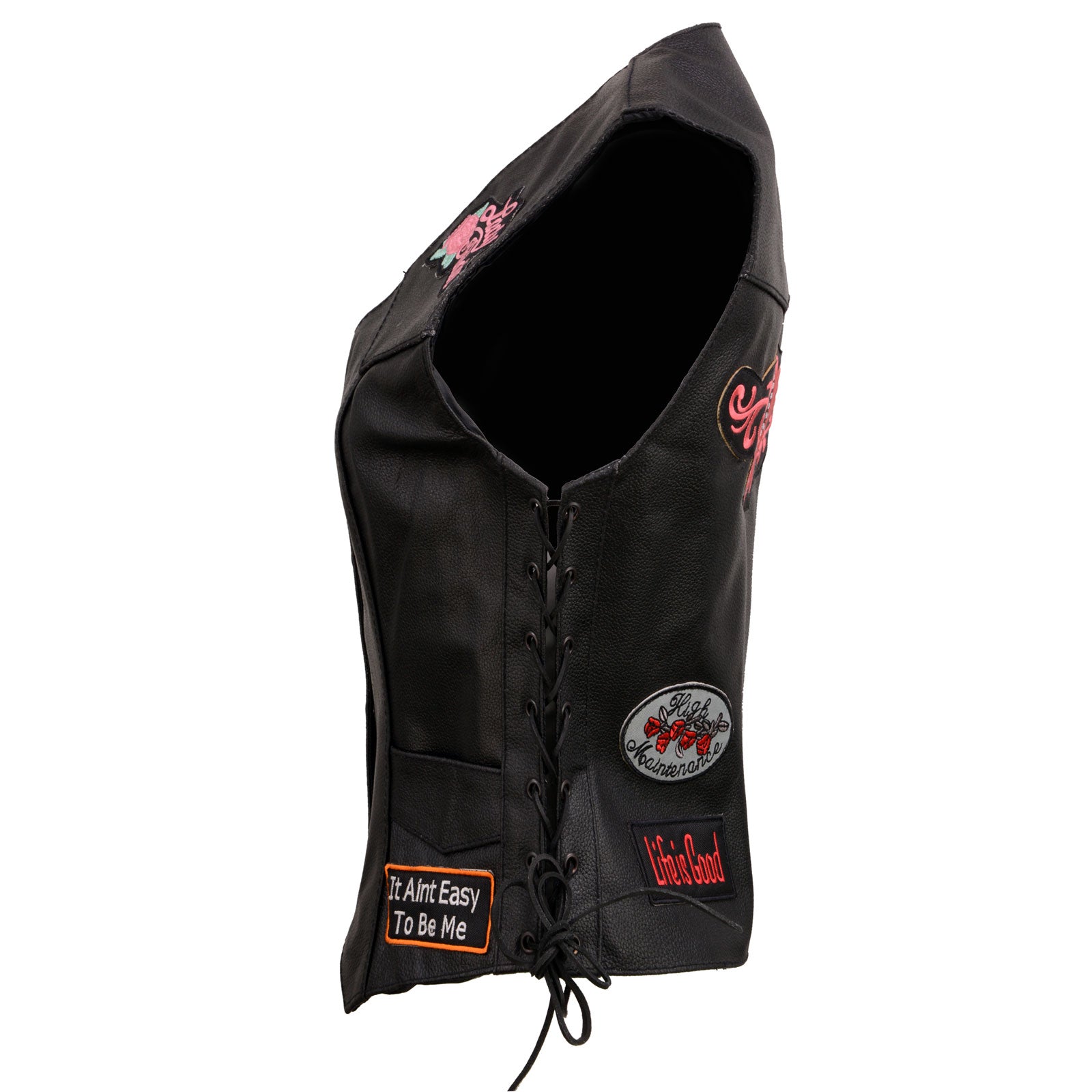 - Snap closure for easy wear: Our women's leather vest is equipped with a snap closure system, allowing for quick and hassle-free wear. The snaps ensure a secure and snug fit, so you can ride with confidence, knowing that your gear will stay in place. The side lace detailing on the black leather vest adds a uniqueness to its design and it also serves a functional purpose by providing an adjustable feature that allows for a personalized fit, ensuring maximum comfort during your rides.