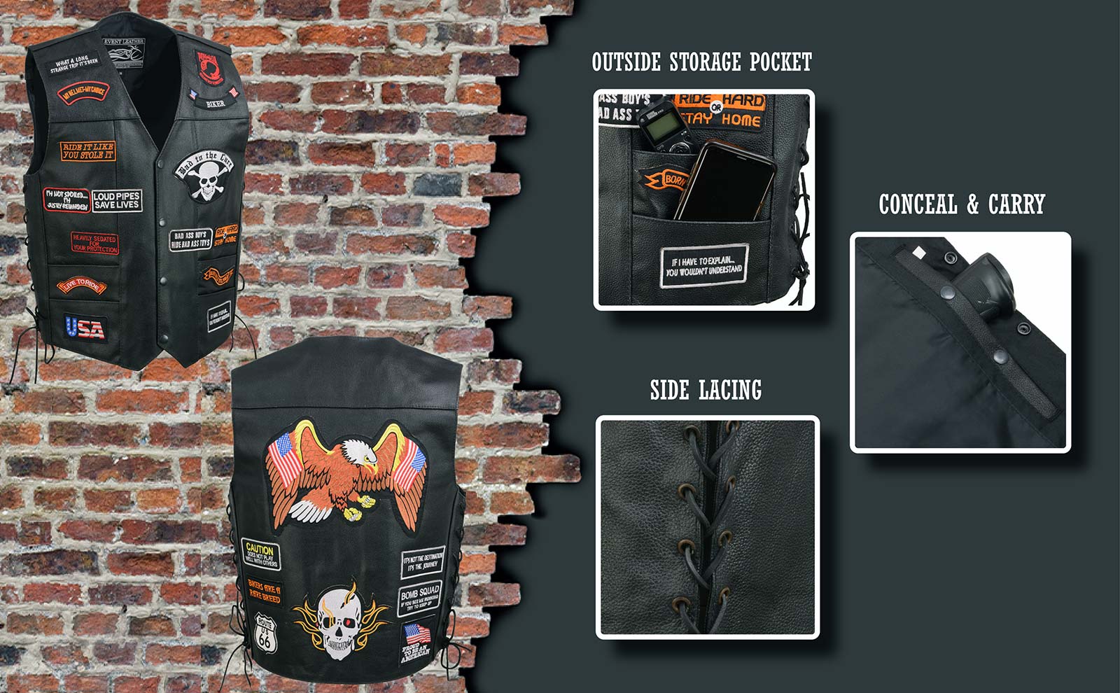 - Event Leather Vest: Our Leather Motorcycle Accessories Are Not Only a Stylish Option for Men, Most Importantly They Provide Durability and Are Abrasion Resistant. It’s Important to Choose Real Leather Because Of Its Longevity, Style, and Strength. These Factors Make It the Best Choice for Motorcycle Riders Because It’s Meant to Take Scratches. Feel Free to Wear Our Leather Vest as A Fashion Statement and Style It with Other Biker Gear for A Statement Look
