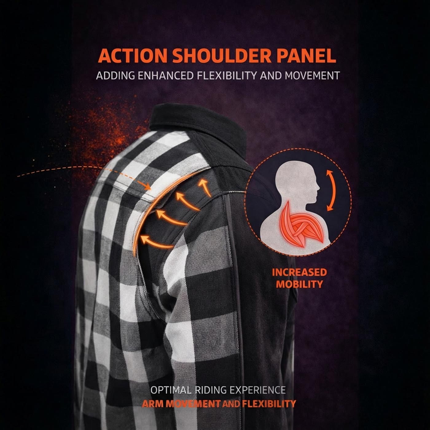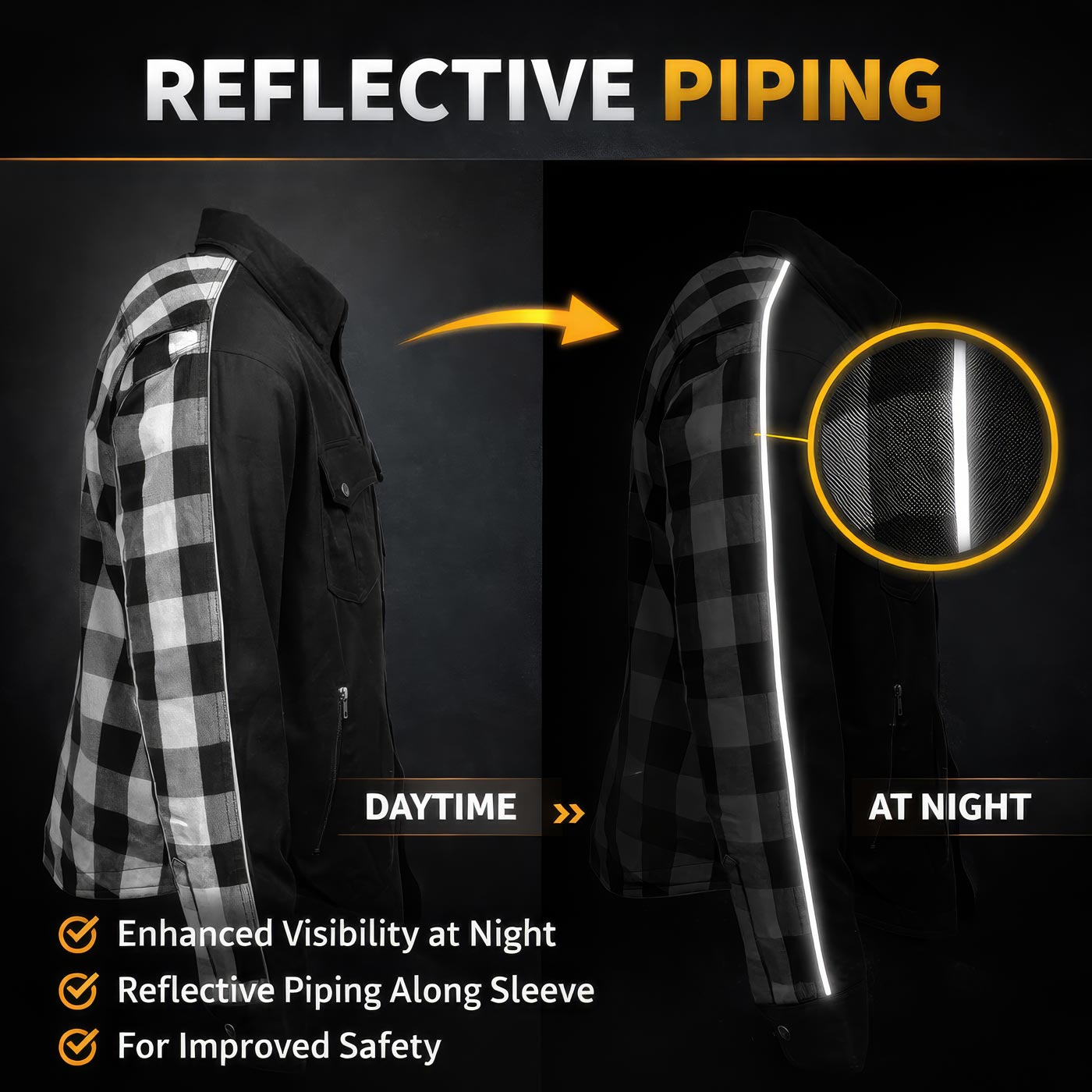 This two-tone version takes our fully lined armored flannel platform—FULL Kevlar® lining, CE armor, vents, mesh liner—and adds a stealth solid front with a bold plaid/checkered back. From the cockpit you get a clean black front; from behind it reads like a classic buffalo-check flannel.